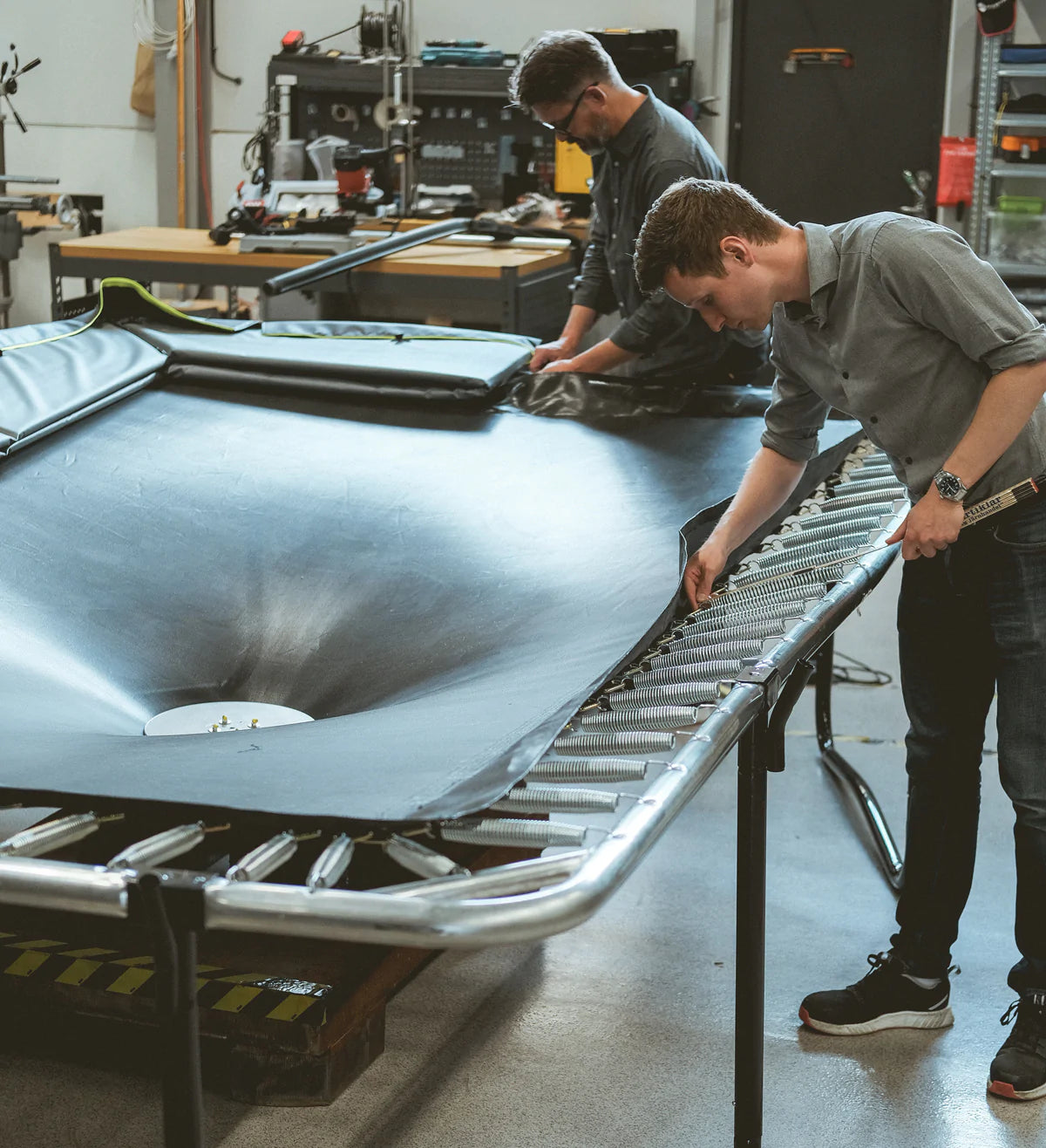 Unter der Leitung und Erfahrung von Thomas Hagel und Glen Bales gibt es ein unerschöpfliches Wissen, was diese beiden bei der Entwicklung von High End Freizeit-Trampolinen anwenden. Als Experten auf ihrem Gebiet haben es sich unsere Ingenieure zum Ziel gesetzt, Ihre Kinder sicher hüpfen zu lassen, indem sie außergewöhnlich starke und sichere Trampoline mit der besten Sprungkraft für den Markt entwickeln!