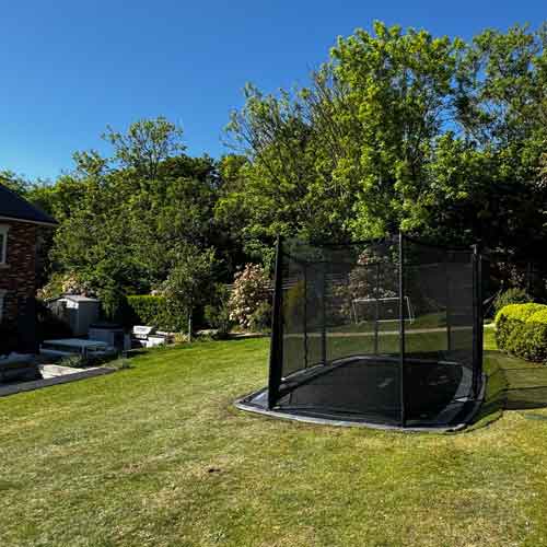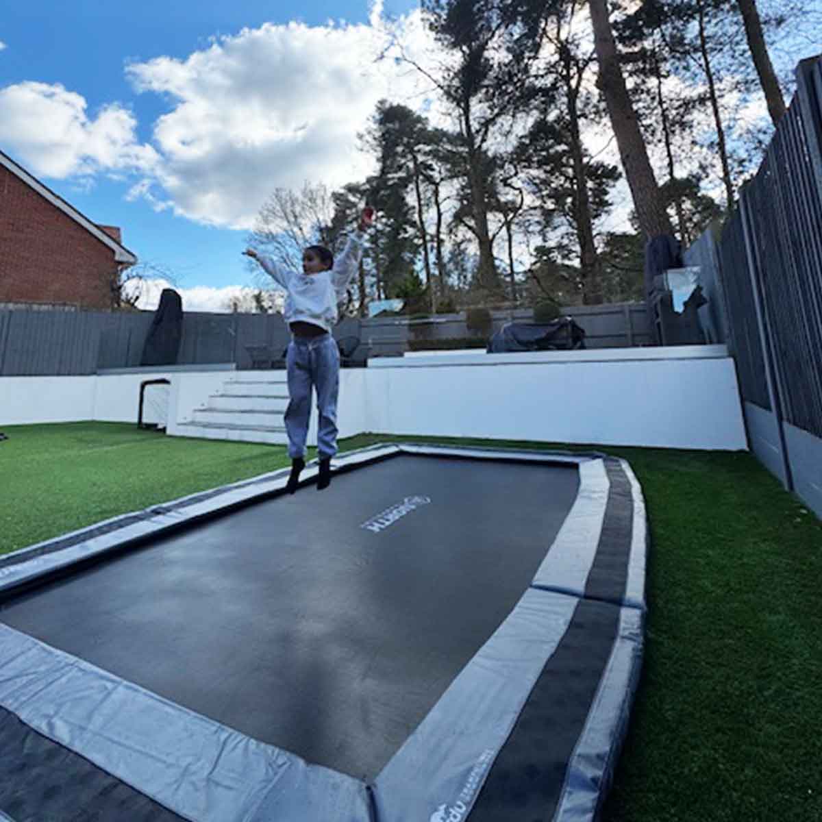 Unser supersicher Trampolin auf Bodenhöhe fügt sich wunderschön in Ihren Garten ein. Wählen Sie zwischen rechteckig oder rund, passend zu Ihrem Platz.